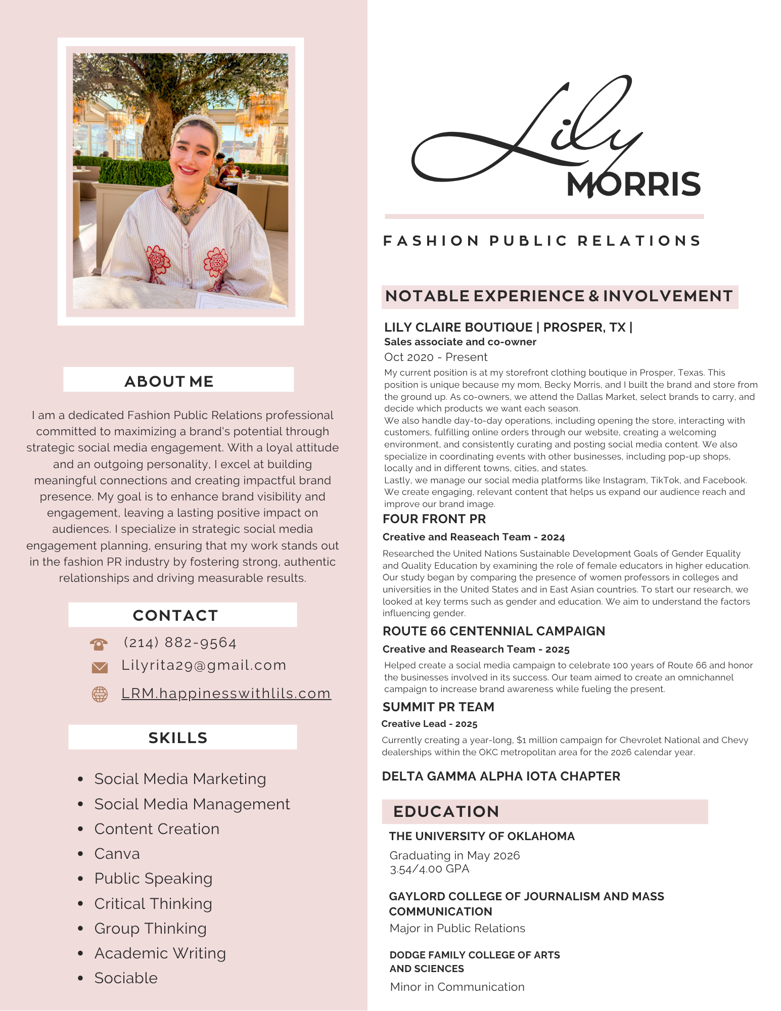 Hello, my name is Lily Morris. I am currently a senior at the University of Oklahoma, majoring in Public Relations. I have owned and operated a boutique for five years and have successfully increased engagement on our social media platforms and brand visibility through strategic social media planning. My unique blend of hands-on retail experience and expertise in social media strategy sets me apart, and I am currently seeking an internship in fashion PR. My goal is to help a brand maximize its potential and leave a lasting positive impact on its audience through effective communication and strategic planning.